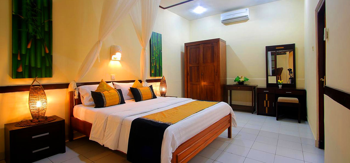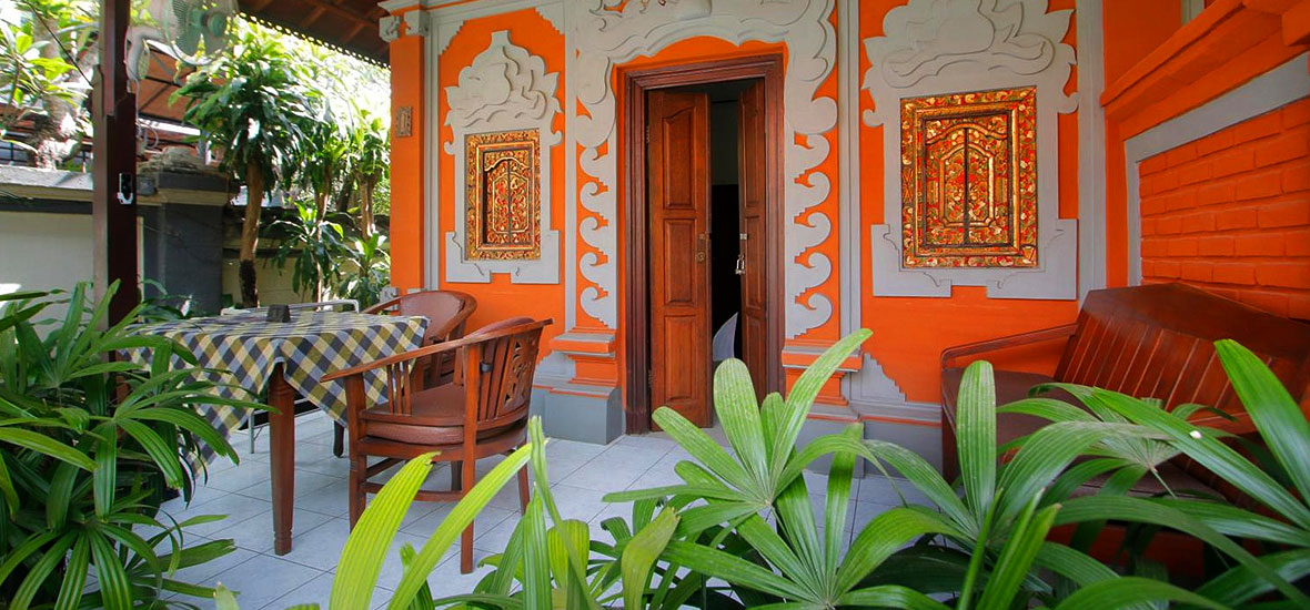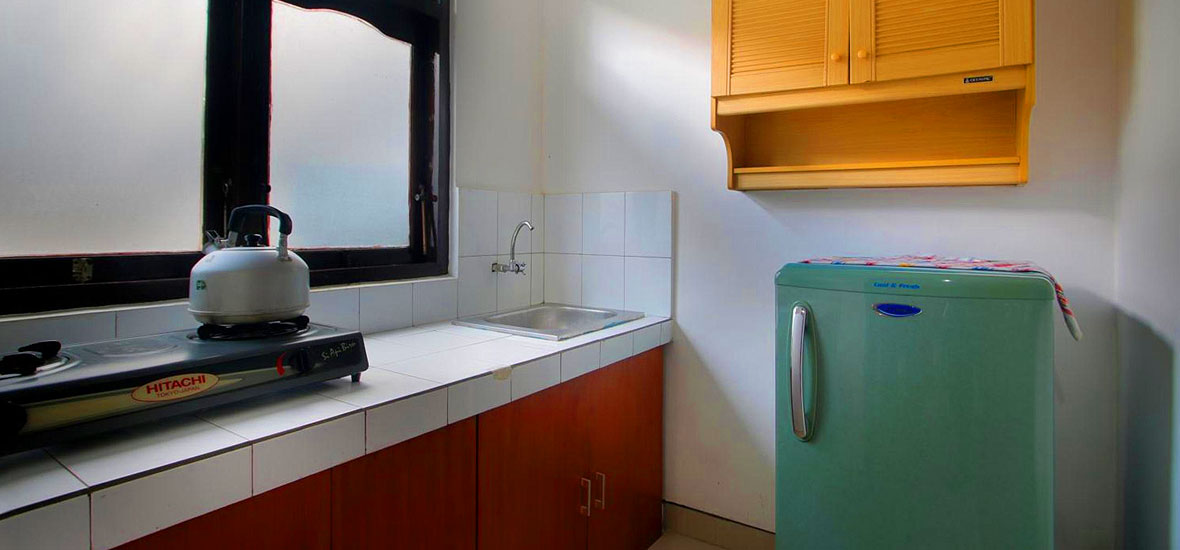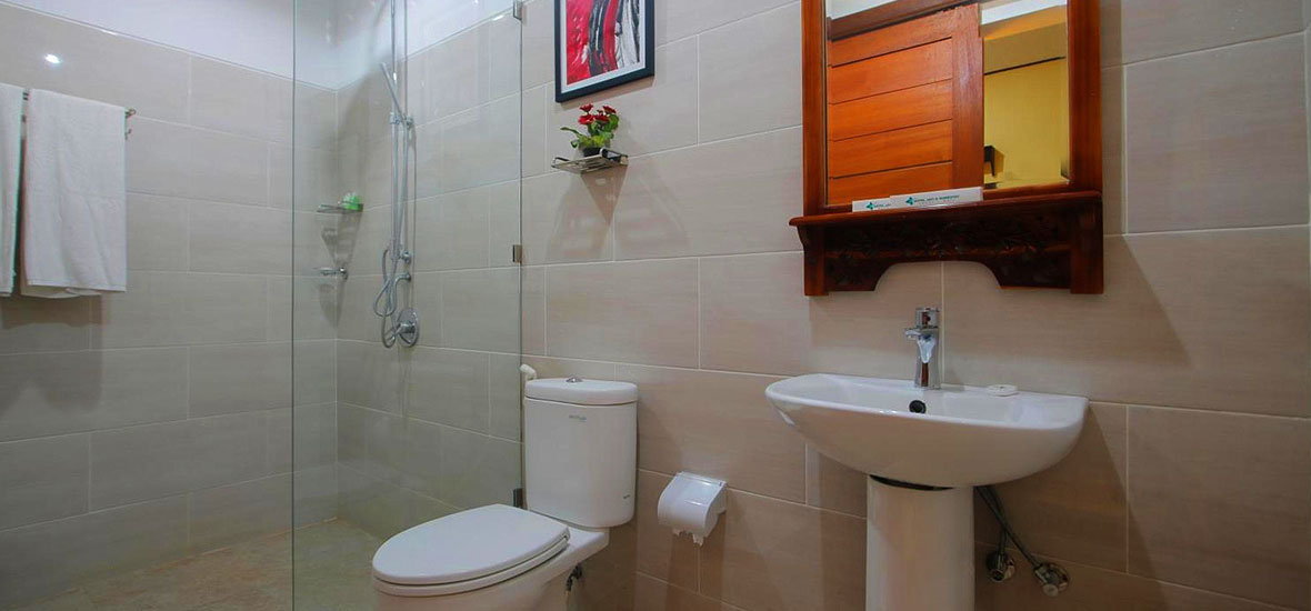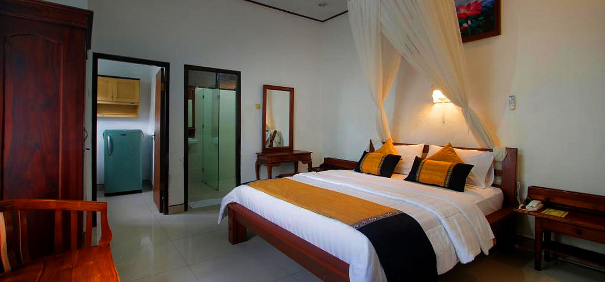 This expansive and cozy chamber is furnished with a comprehensively stocked kitchen, air conditioning, television, writing desk, refrigerator, closet, mosquito screen, and WiFi connectivity. The attached private bathroom is supplied with clean towels, a bathtub, a shower, and necessary toiletries. The terrace, offering a scenic vista of the verdant tropical garden, features a pair of seats and a small table.